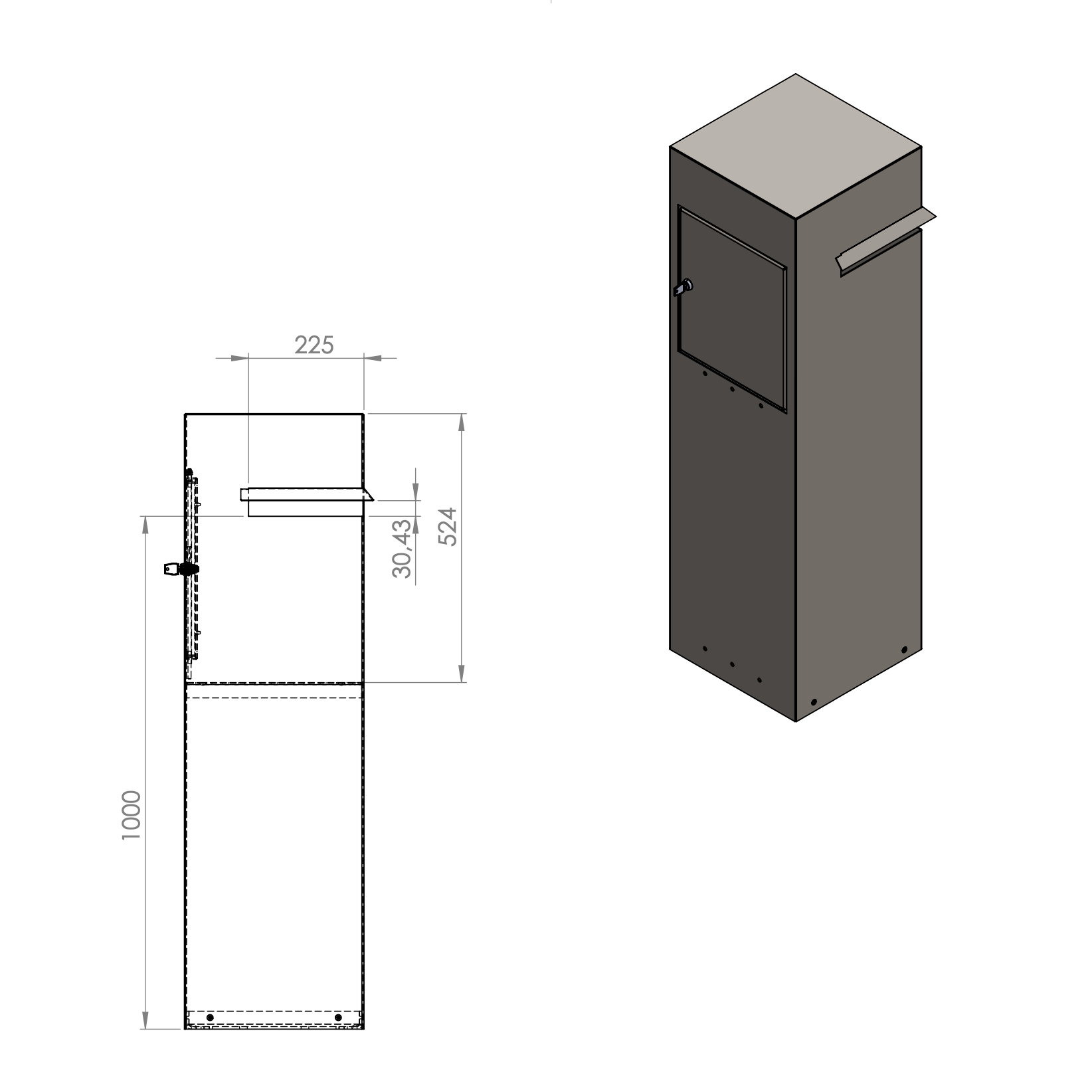 De brievenbus is 35 cm breed, 35 cm diep, 120 cm hoog en weegt 13 kg.