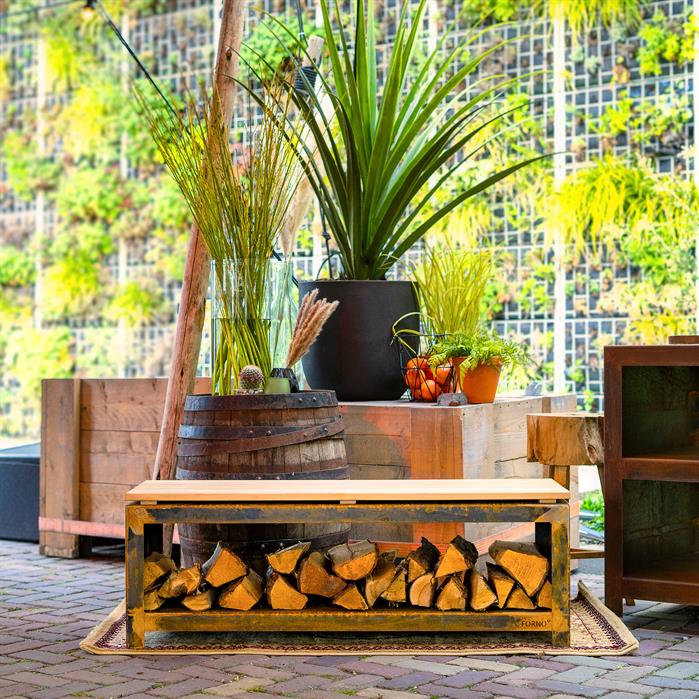 Een mooie, maar eenvoudige zitbank met een zitvlak van massief hout en geïntegreerde opslagruimte voor haardhout. De bank is gemaakt van 3 mm cortenstaal en voorzien van naar binnen gebogen randen aan beide zijden. De bank is verkrijgbaar in twee afmetingen: