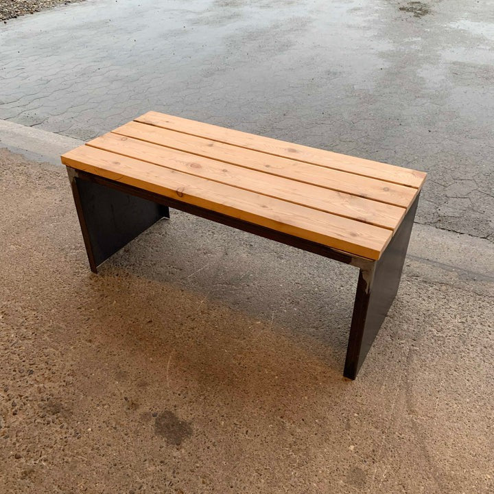 Een eenvoudige bank van cortenstaal. Duurzaam en perfect geschikt voor de minimalistische tuin. Dit model is bekleed met larikshout, dat direct op het staal wordt geschroefd. Het hout vergrijst na verloop van tijd, maar kan ook worden behandeld met olie om de oorspronkelijke kleur te behouden.