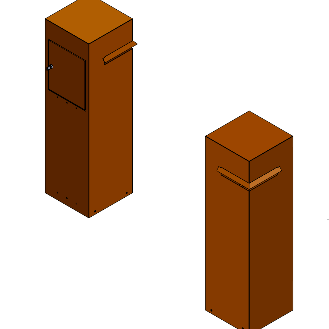De brievenbus heeft een brievenklep aan de voorkant en een deur met slot aan de achterkant, waar de post wordt verameld. De brievenbus is gemaakt van 2 mm cortenstaal en heeft afgeschuinde hoeken. Op verzoek kan het slot worden vergangen door een ander model.