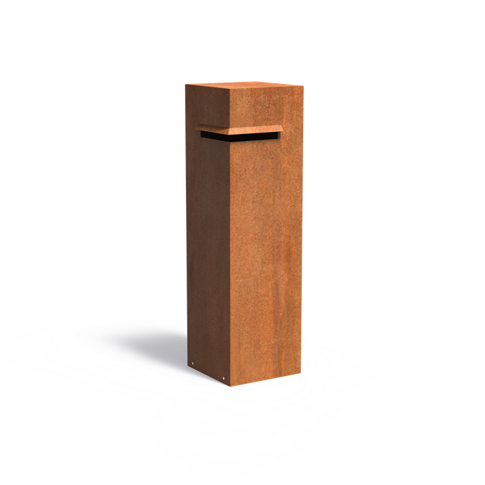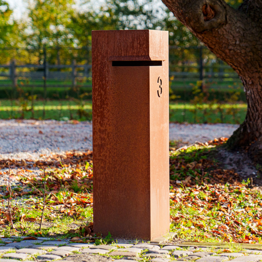 Deze brievenbus heeft een stijlvol en minimalistisch design, met een brieveninworp in de hoek. De perfecte oplossing voor je oprit met plantenbakken van cortenstaal.