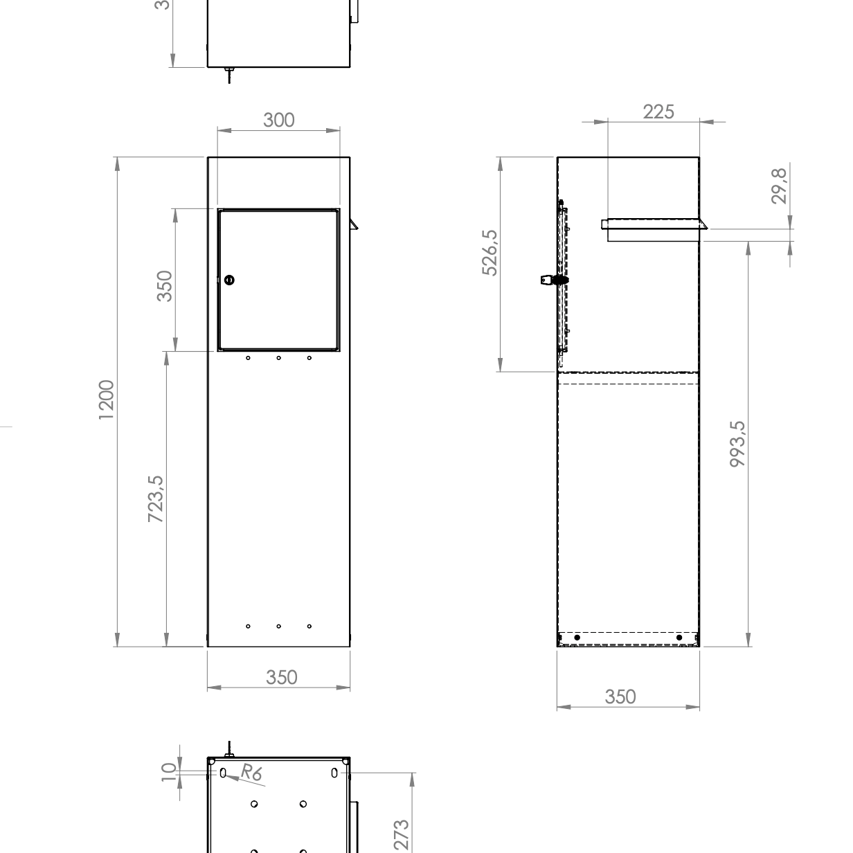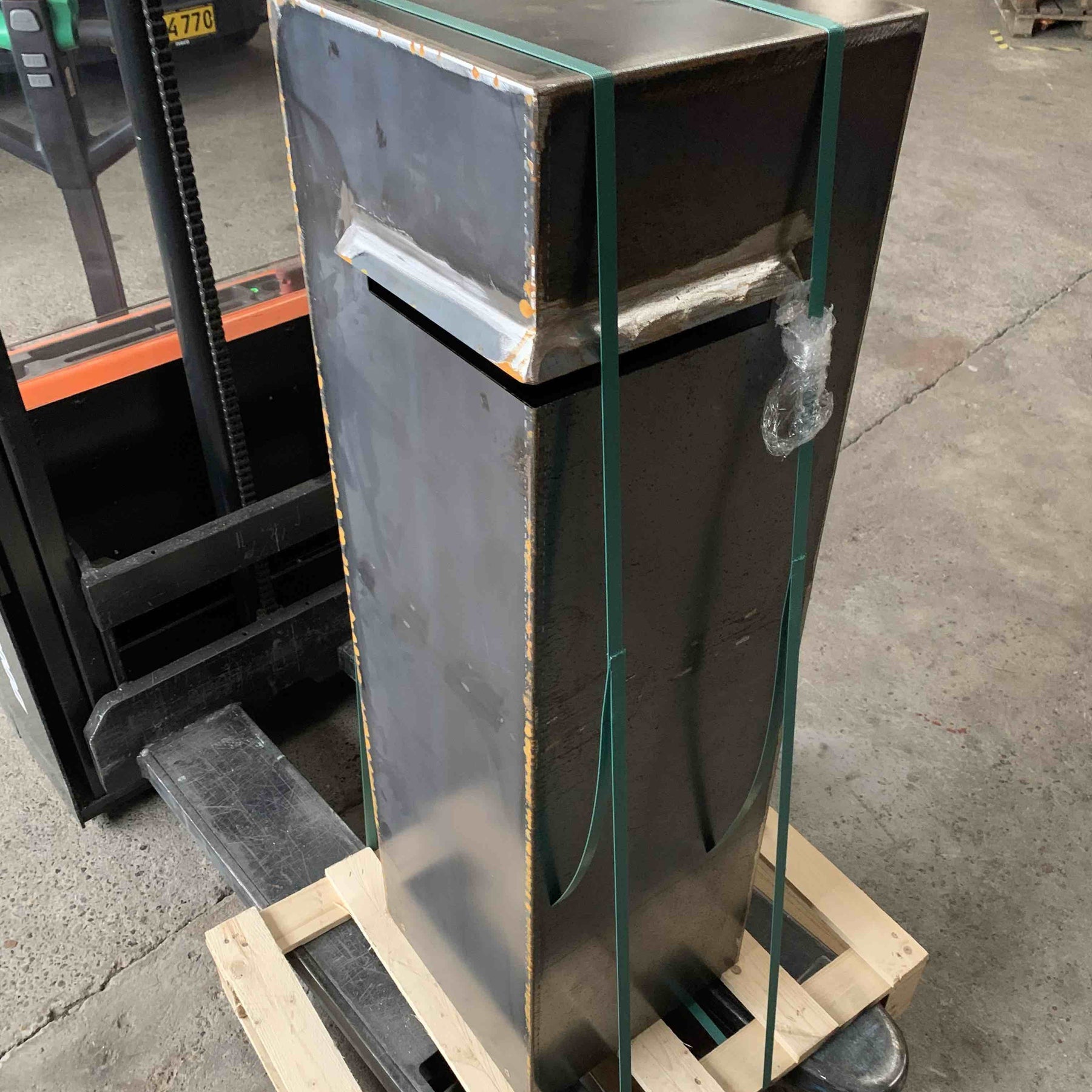 De brievenbus is 35 cm breed, 35 cm diep, 120 cm hoog en weegt ca. 27 kg.