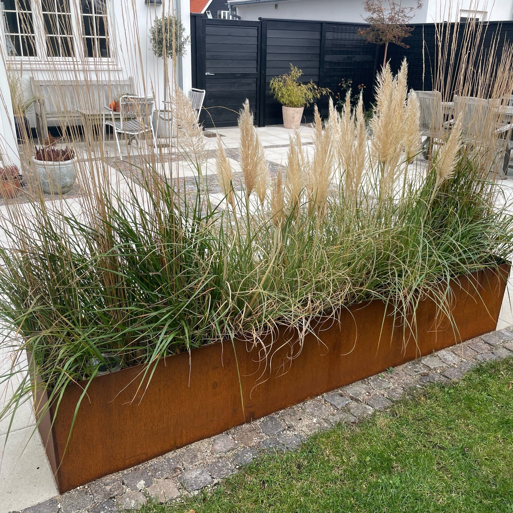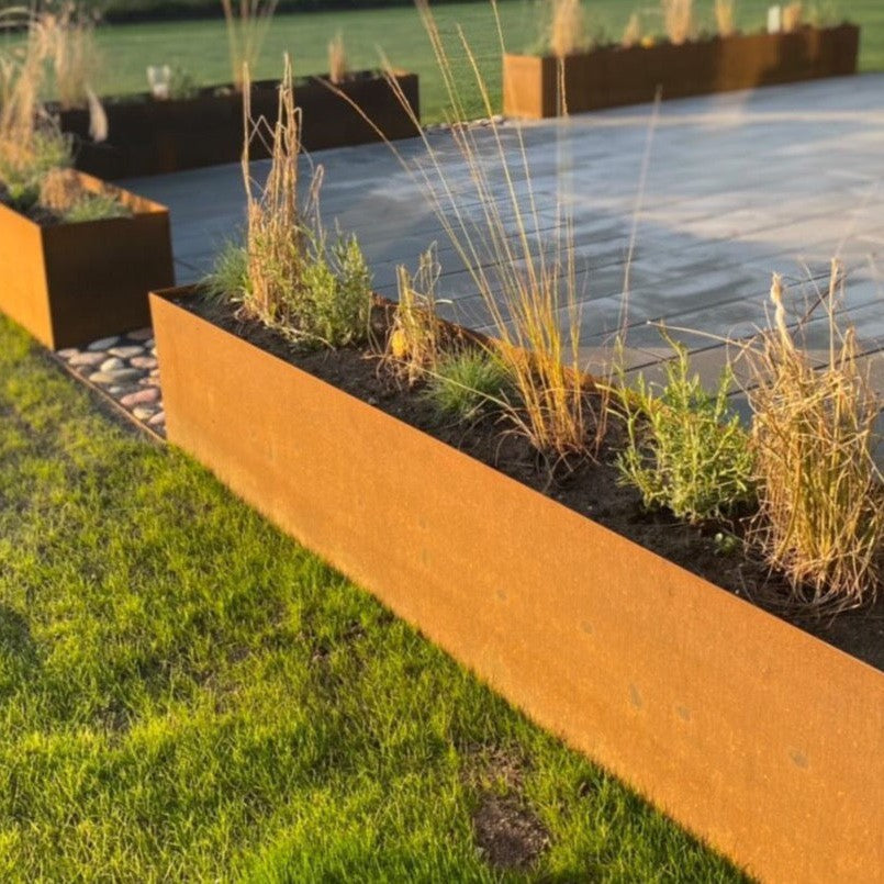 De plantenbak is van hoge kwaliteit, handgemaakt in onze fabriek in Denemarken, en vervaardigd uit 3 mm cortenstaal. Volledig gelaste hoeken en interne verstevigingen zorgen ervoor dat de bak bestand is tegen de volledige levensduur van het staal. Je hoeft je dus geen zorgen te maken over naden of verbindingen - denk liever alvast na over wat je in de plantenbak wilt planten.