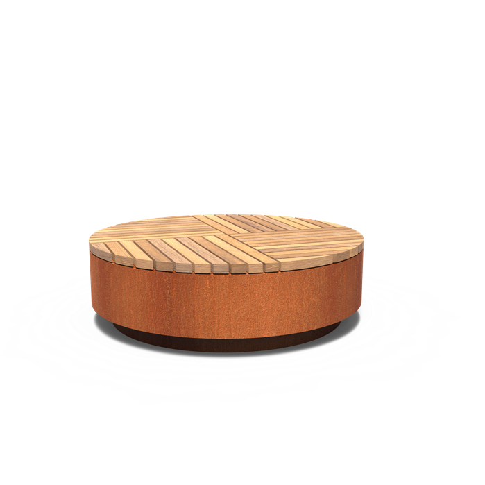 Deze exclusieve, ronde bank is gemaakt van 3 mm cortenstaal en afgewerkt met massief Garapa-hout.